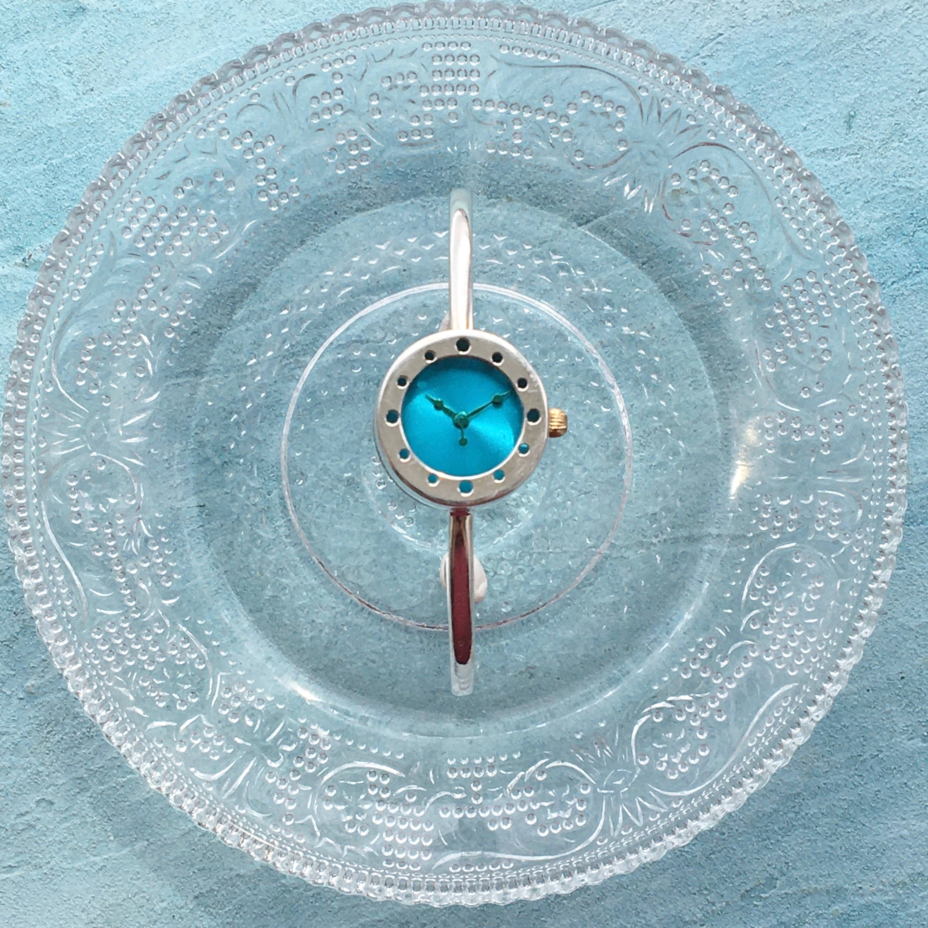 透き通った青色の爽快な夏を感じるステンドガラスのバングル型時計です。