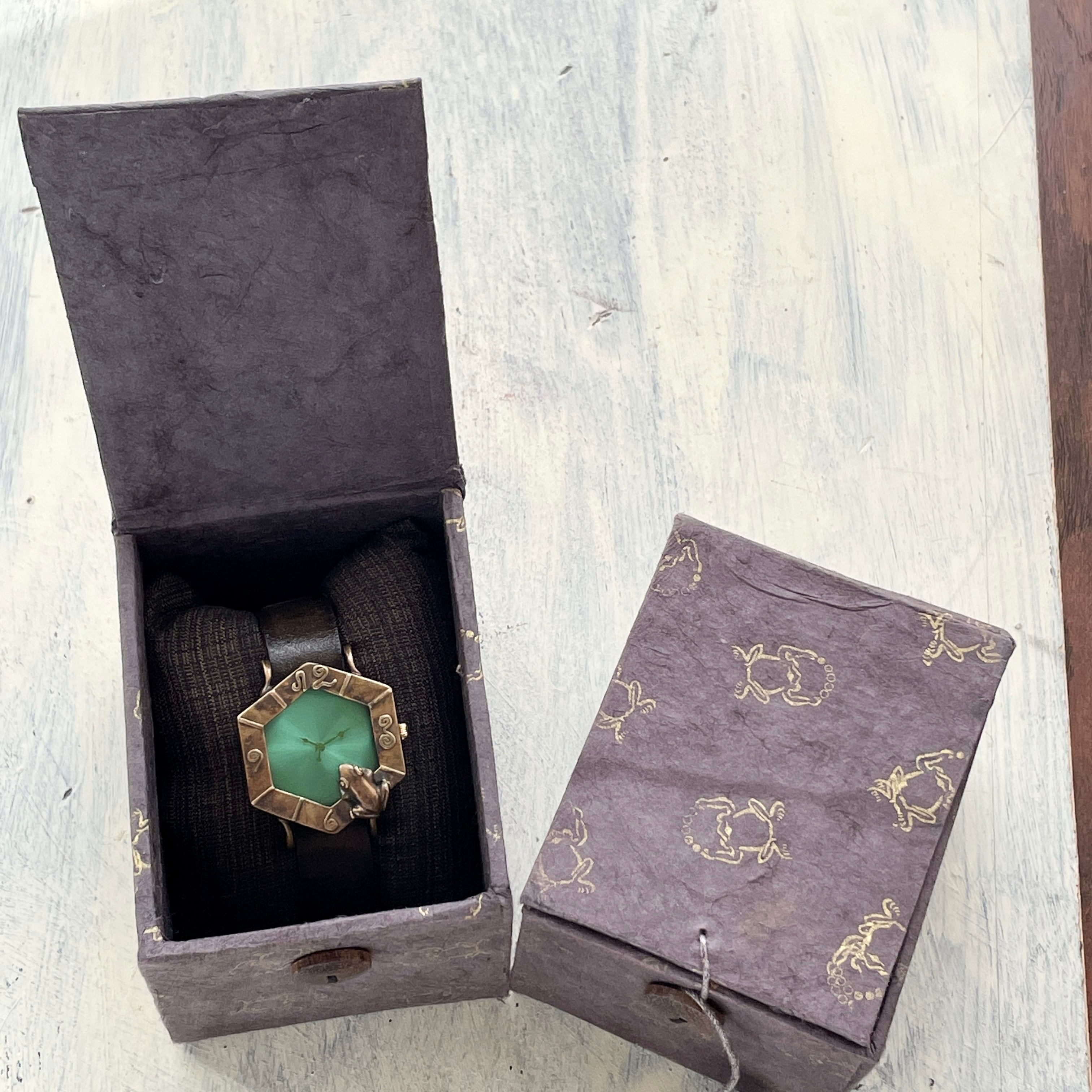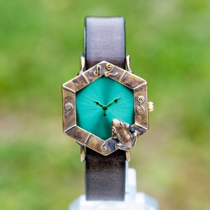 若草色のステンドガラスをあしらった六角形型の腕時計です。